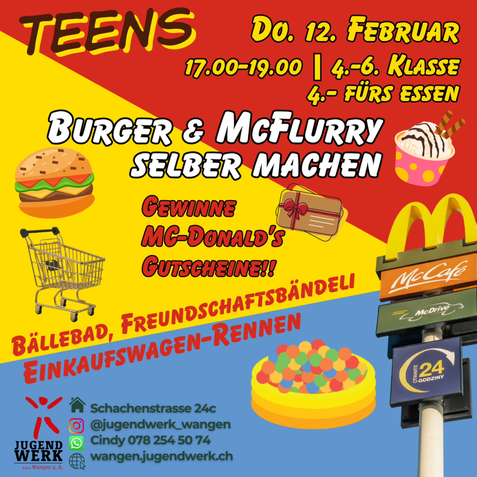 Diesen Donnerstag findet wieder das Teens (4.-6.Klasse) statt. Komm vorbei und mache dein Burger & MC. Flurry selber sowie gewinne MC-Gutscheine!